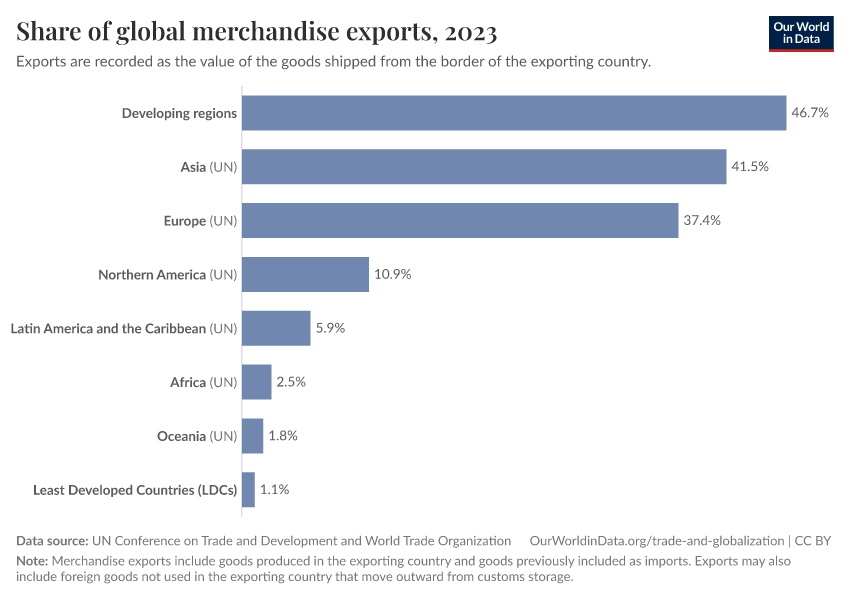 “Data Page: Share of global merchandise exports”. Our World in Data (2026). Data adapted from UN Conference on Trade and Development and World Trade Organization. Retrieved from https://data-unoosa-launches.owid.pages.dev:8789/20260130-180113/grapher/share-of-global-merchandise-exports.html [online resource] (archived on January 30, 2026).How to cite this data