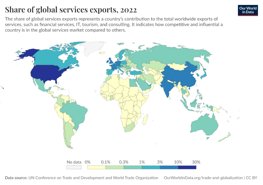 “Data Page: Share of global services exports”. Our World in Data (2026). Data adapted from UN Conference on Trade and Development and World Trade Organization. Retrieved from https://data-unoosa-launches.owid.pages.dev:8789/20260130-180113/grapher/share-of-global-services-exports.html [online resource] (archived on January 30, 2026).How to cite this data