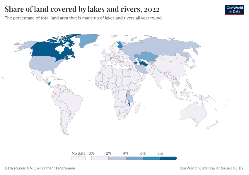 “Data Page: Share of land covered by lakes and rivers”. Our World in Data (2026). Data adapted from UN Environment Programme. Retrieved from https://data-unoosa-launches.owid.pages.dev:8789/20260130-180113/grapher/share-of-land-covered-by-lakes-and-rivers.html [online resource] (archived on January 30, 2026).How to cite this data