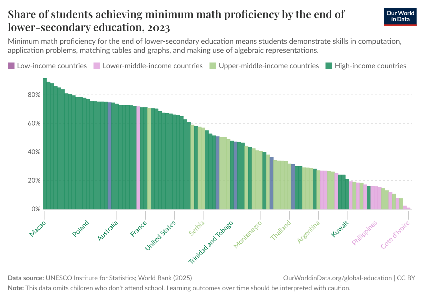 “Data Page: Share of students achieving minimum math proficiency by the end of lower-secondary education”. Our World in Data (2026). Data adapted from UNESCO Institute for Statistics. Retrieved from https://data-unoosa-launches.owid.pages.dev:8789/20260130-180113/grapher/share-of-students-at-end-of-lower-secondary-education-achieving-minimum-math-proficiency.html [online resource] (archived on January 30, 2026).How to cite this data