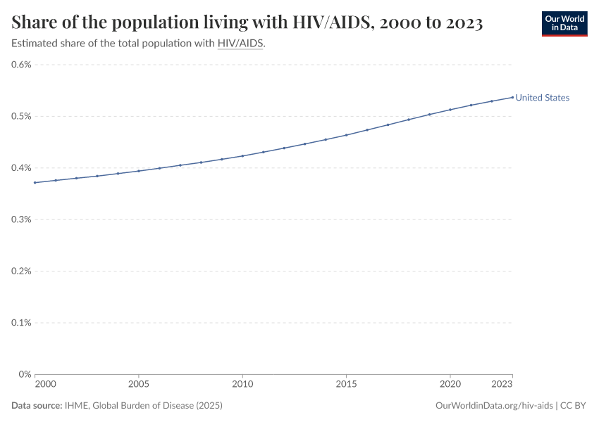 IHME, Global Burden of Disease (2025) – with major processing by Our World in Data. “Share of the population living with HIV/AIDS” [dataset]. IHME, Global Burden of Disease, “Global Burden of Disease - Prevalence and Incidence” [original data]. Retrieved February 25, 2026 from https://data-unoosa-launches.owid.pages.dev:8789/20260212-172859/grapher/share-of-the-population-living-with-hivaids.html (archived on February 12, 2026).
