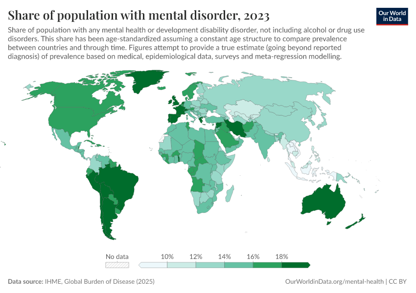 IHME, Global Burden of Disease (2025) – with major processing by Our World in Data. “Share of population with mental disorder” [dataset]. IHME, Global Burden of Disease, “Global Burden of Disease - Mental Health Prevalence” [original data]. Retrieved February 25, 2026 from https://data-unoosa-launches.owid.pages.dev:8789/20260212-100858/grapher/share-with-mental-health-or-development-disorder.html (archived on February 12, 2026).