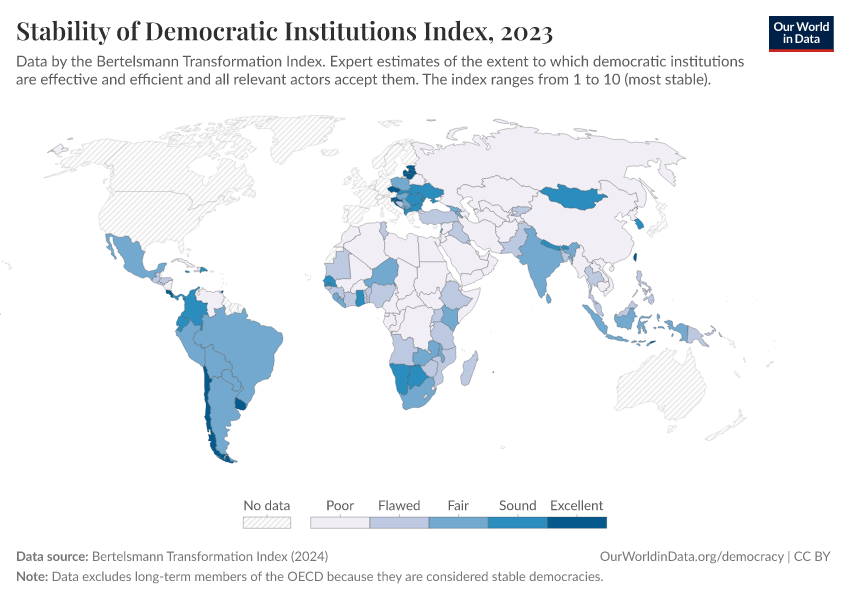 Bertelsmann Transformation Index (2024) – processed by Our World in Data. “Stability of Democratic Institutions Index” [dataset]. Bertelsmann Transformation Index, “Bertelsmann Transformation Index, Scores” [original data]. Retrieved February 25, 2026 from https://data-unoosa-launches.owid.pages.dev:8789/20260105-133053/grapher/stability-democratic-institutions-index-bti.html (archived on January 5, 2026).
