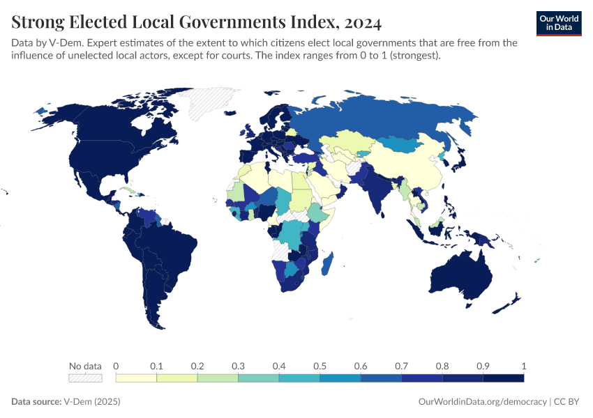 V-Dem (2025) – processed by Our World in Data. “Elected local governments – V-Dem” [dataset]. V-Dem, “Democracy report v15” [original data]. Retrieved February 25, 2026 from https://data-unoosa-launches.owid.pages.dev:8789/20260119-070102/grapher/strong-elected-local-governments-index.html (archived on January 19, 2026).