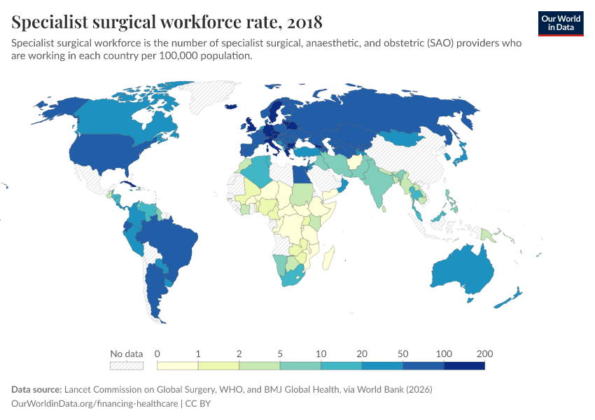 “Data Page: Specialist surgical workforce rate”. Our World in Data (2026). Data adapted from Lancet Commission on Global Surgery, WHO, and BMJ Global Health, via World Bank. Retrieved from https://data-unoosa-launches.owid.pages.dev:8789/20260202-181317/grapher/surgeons-per-100000.html [online resource] (archived on February 2, 2026).How to cite this data