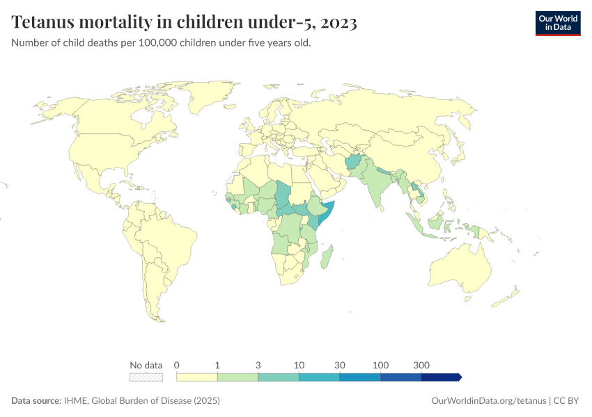“Data Page: Tetanus mortality in children under-5”, part of the following publication: Esteban Ortiz-Ospina and Max Roser (2016) - “Global Health”. Data adapted from IHME, Global Burden of Disease. Retrieved from https://data-unoosa-launches.owid.pages.dev:8789/20260211-174736/grapher/tetanus-mortality-in-children-under-5.html [online resource] (archived on February 11, 2026).How to cite this data
