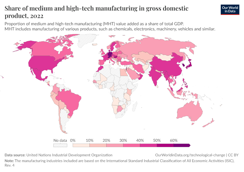 “Data Page: Share of medium and high-tech manufacturing in gross domestic product”. Our World in Data (2026). Data adapted from United Nations Industrial Development Organization. Retrieved from https://data-unoosa-launches.owid.pages.dev:8789/20260130-180113/grapher/total-manufacturing-value-added-from-high-tech.html [online resource] (archived on January 30, 2026).How to cite this data