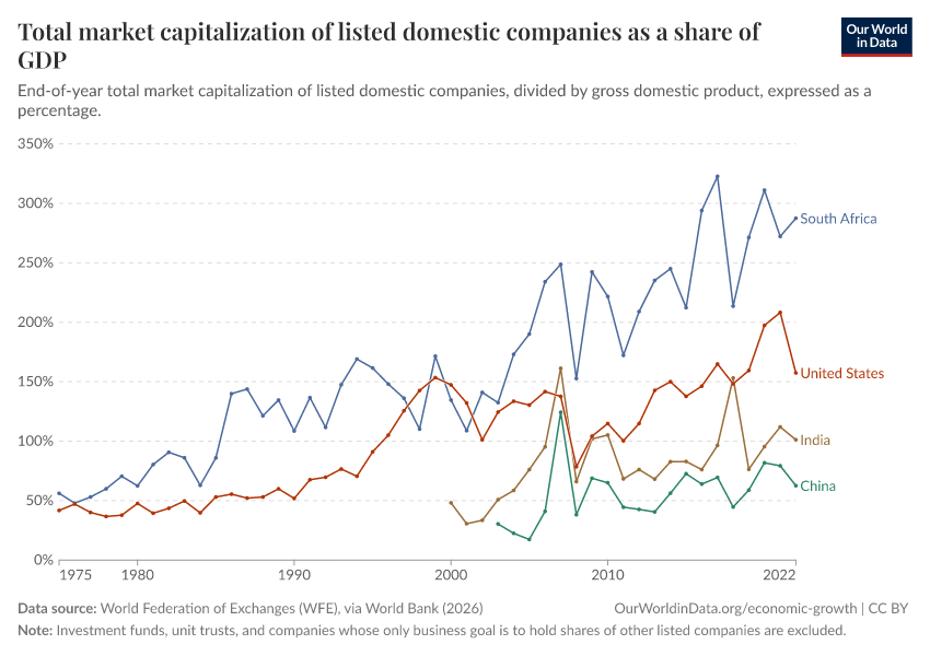 “Data Page: Total market capitalization of listed domestic companies as a share of GDP”. Our World in Data (2026). Data adapted from World Federation of Exchanges (WFE), via World Bank. Retrieved from https://data-unoosa-launches.owid.pages.dev:8789/20260202-181317/grapher/total-market-capitalization-listed-domestic-companies-share-gdp.html [online resource] (archived on February 2, 2026).How to cite this data