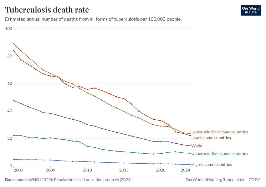 “Data Page: Tuberculosis death rate”, part of the following publication: Saloni Dattani, Fiona Spooner, Hannah Ritchie, and Max Roser (2023) - “Tuberculosis”. Data adapted from WHO, Various sources. Retrieved from https://data-unoosa-launches.owid.pages.dev:8789/20260205-170810/grapher/tuberculosis-death-rate.html [online resource] (archived on February 5, 2026).
