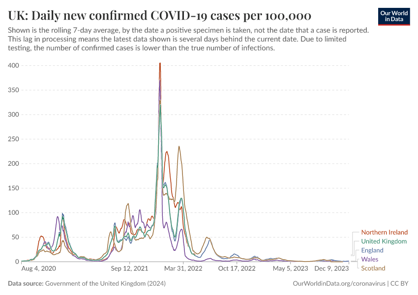 Government of the United Kingdom (2024) – with minor processing by Our World in Data. “UK: Daily new confirmed COVID-19 cases per 100,000” [dataset]. Government of the United Kingdom, “UKHSA data dashboard” [original data]. Retrieved February 25, 2026 from https://data-unoosa-launches.owid.pages.dev:8789/20250909-093708/grapher/uk-daily-covid-cases-7day-average.html (archived on September 9, 2025).