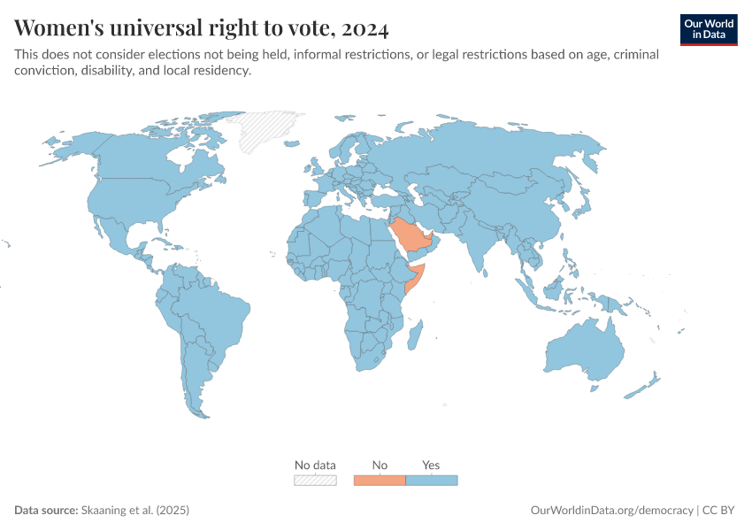 Skaaning et al. (2025) – processed by Our World in Data. “Women's universal right to vote” [dataset]. Skaaning et al., “Lexical Index of Electoral Democracy (LIED) v6.8” [original data]. Retrieved February 24, 2026 from https://data-unoosa-launches.owid.pages.dev:8789/20260119-065148/grapher/universal-suffrage-women-lexical.html (archived on January 19, 2026).