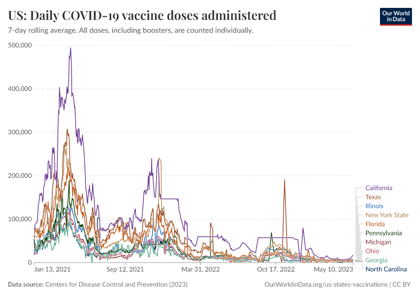 Centers for Disease Control and Prevention (2023) – processed by Our World in Data. “US: Daily COVID-19 vaccine doses administered” [dataset]. Centers for Disease Control and Prevention, “COVID-19, Vaccinations (United States)” [original data]. Retrieved February 24, 2026 from https://data-unoosa-launches.owid.pages.dev:8789/20250909-093708/grapher/us-daily-covid-vaccine-doses-administered.html (archived on September 9, 2025).