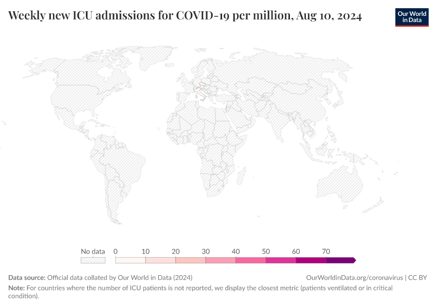 “Data Page: Weekly new ICU admissions for COVID-19 per million”, part of the following publication: Edouard Mathieu, Hannah Ritchie, Lucas Rodés-Guirao, Cameron Appel, Daniel Gavrilov, Charlie Giattino, Joe Hasell, Bobbie Macdonald, Saloni Dattani, Diana Beltekian, Esteban Ortiz-Ospina, and Max Roser (2020) - “COVID-19 Pandemic”. Data adapted from Official data collated by Our World in Data. Retrieved from https://data-unoosa-launches.owid.pages.dev:8789/20250909-093708/grapher/weekly-icu-admissions-covid-per-million.html [online resource] (archived on September 9, 2025).
