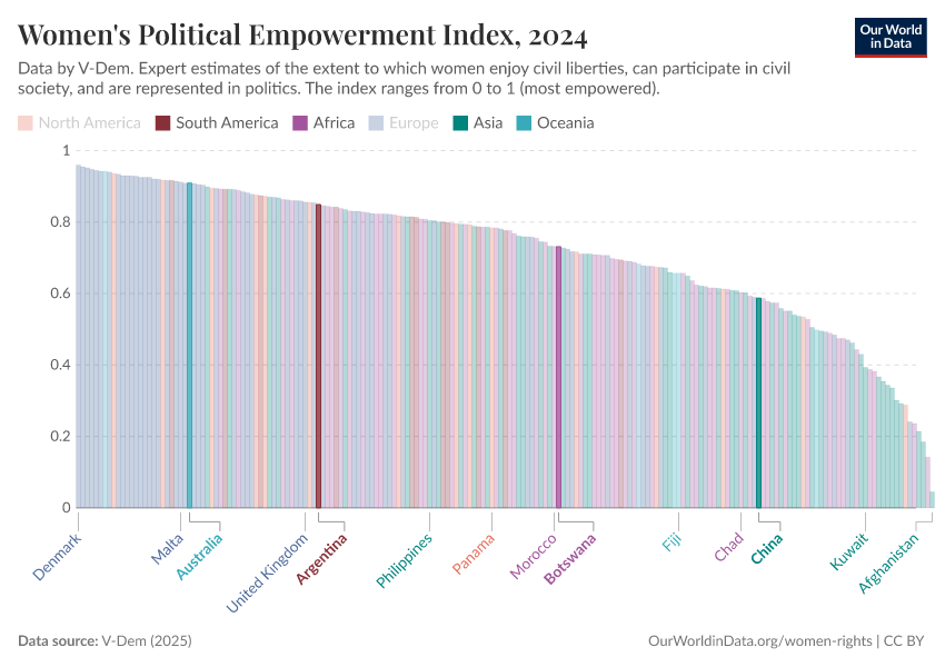 “Data Page: Women's political empowerment index”, part of the following publication: Bastian Herre, Lucas Rodés-Guirao, and Esteban Ortiz-Ospina (2013) - “Democracy”. Data adapted from V-Dem. Retrieved from https://data-unoosa-launches.owid.pages.dev:8789/20260119-070102/grapher/women-political-empowerment-index.html [online resource] (archived on January 19, 2026).