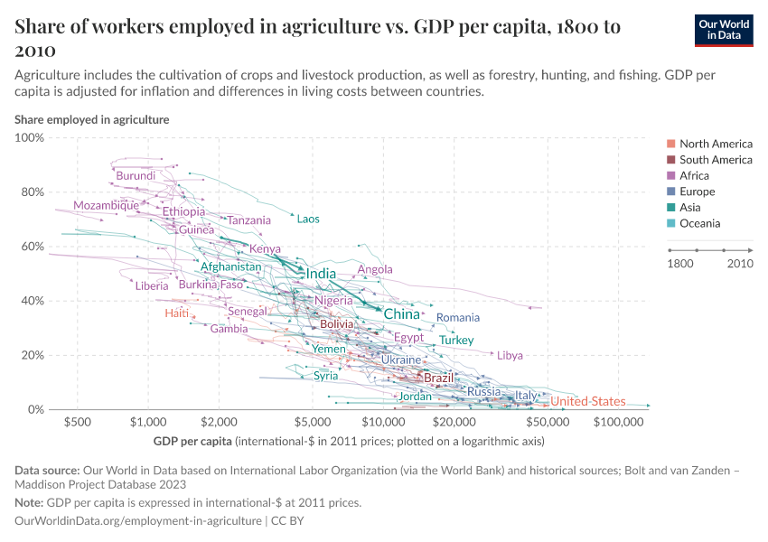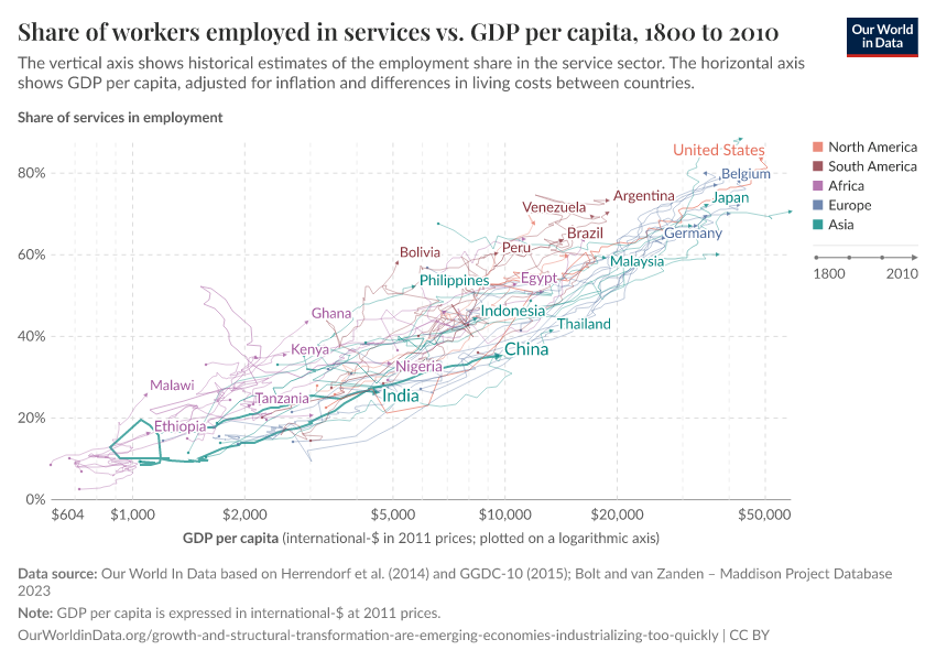 One way to study the process of “structural transformation” across countries is to track how employment changes across sectors in the economy. The below chart does this, plotting the share of industry in total employment (vertical axis) against GDP per head (horizontal axis). This graph is a “connected scatter plot” — each line shows the trajectory that a country followed over time along these two dimensions. Data is available for a selection of more than 40 countries, across all continents.