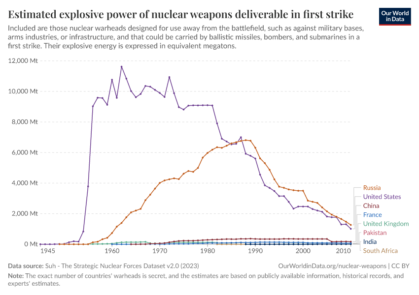The data shown in the following chart attempts to take this into account. It considers the destructiveness and deployment of nuclear warheads to arrive at an estimate of the explosive power of nuclear weapons deliverable in a first strike.
