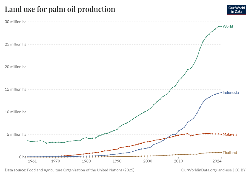 Shown in the chart is the amount of land that the world devotes to vegetable oil crop production. Palm oil accounts for a small slice of this land use, which is notable when we consider that it produces the largest share of the oil.