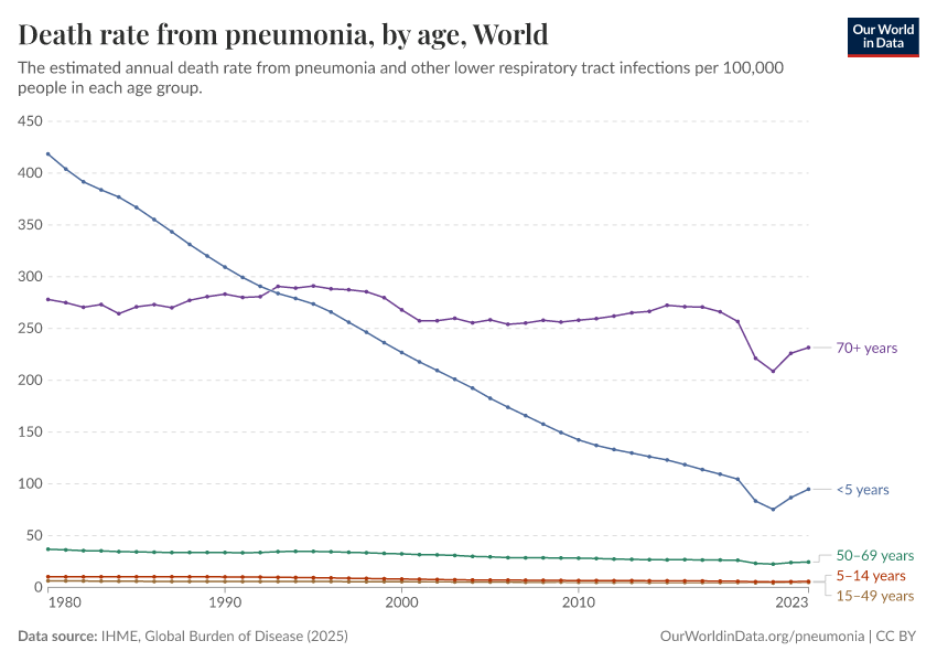 On this topic page, we look at who is suffering from pneumonia and why — and what can we do to reduce the number of people dying from this disease, with interventions such as vaccination, oxygen therapy, reducing air pollution, and more.