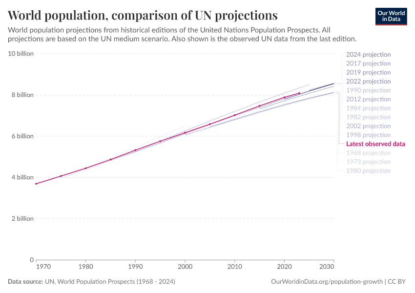 Hannah Ritchie (2023) - “The UN has made population projections for more than 50 years – how accurate have they been?” Published online at OurWorldinData.org. Retrieved from: 'https://data-unoosa-launches.owid.pages.dev:8789/20251125-173858/population-projections.html' [Online Resource] (archived on November 25, 2025).BibTeX citation