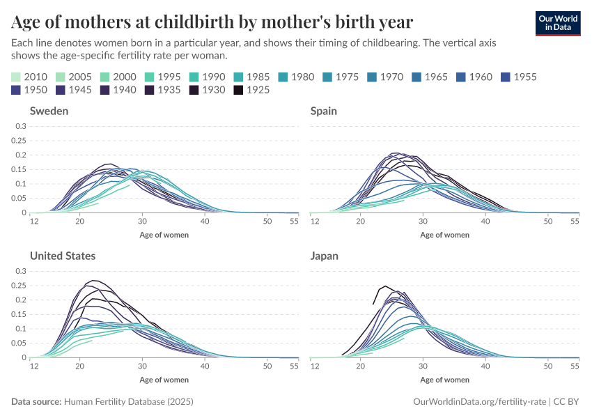 In Sweden, for example, the curve has shifted to the right: younger generations of women are having children later than in the past, but this hasn’t led to a drop in the average number of children per woman.