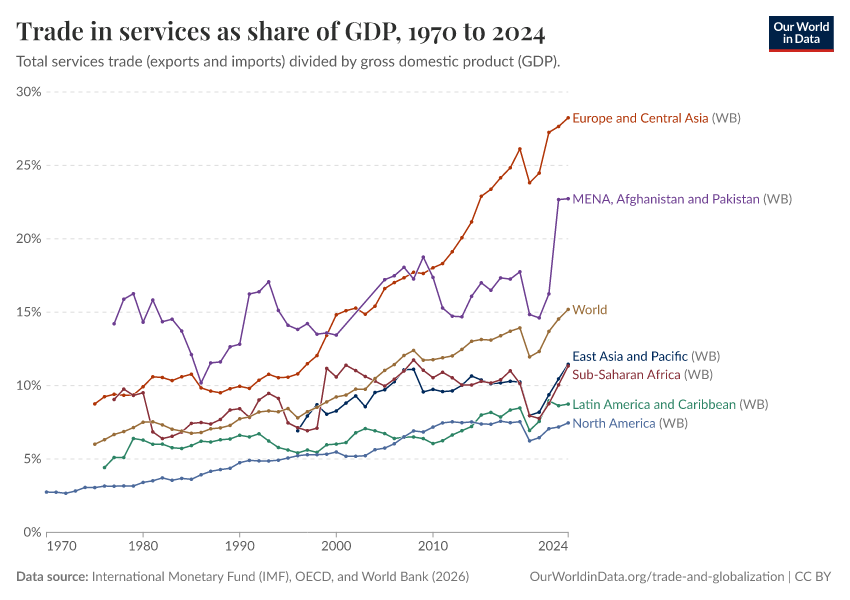 Globally, trade in goods accounts for the majority of trade transactions. But as this chart shows, the share of services in total global exports has been increasing in recent decades.