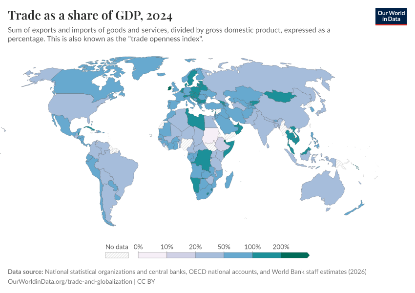 If you press the play button on the map, you can see how trade openness has changed over time across all countries.