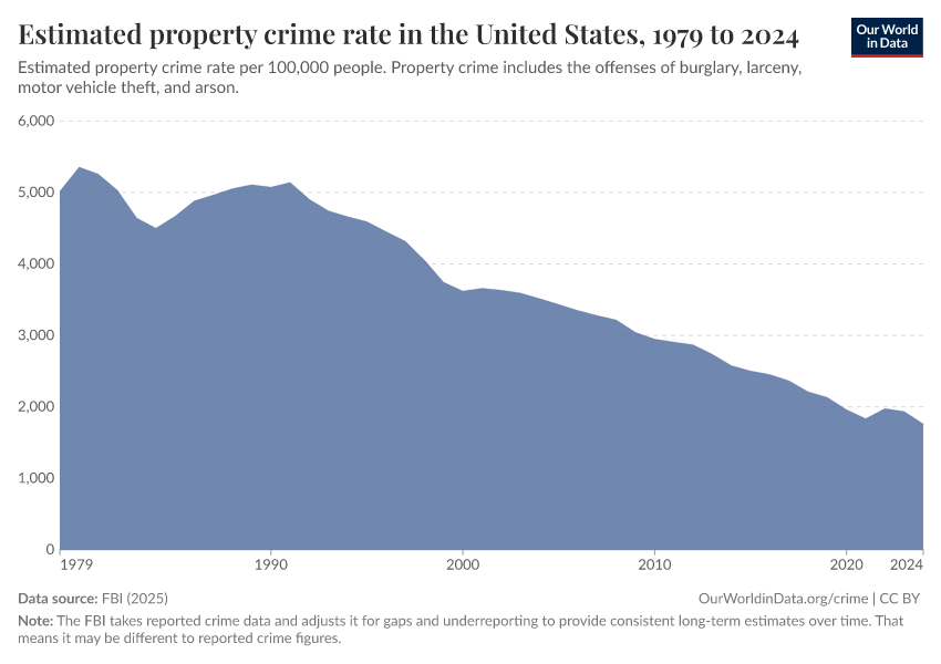 The trend is similar to what we saw for violent crime. Rates were high throughout the 1980s and into the early 1990s, but have fallen by 60% in the last 30 years. Unlike violent crime rates, there has been less variability from year to year, resulting in a fairly consistent downward trend.
