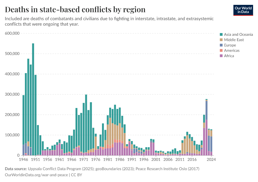 Our team has created two additional Data Explorers to make even more data on armed conflicts and war easier to access and understand. They provide and explain data from six leading datasets: on how deadly and common they are, which countries are involved, and where they take place. You can learn more about which measure and data source can best answer your questions in our articles explaining the metrics and datasets.