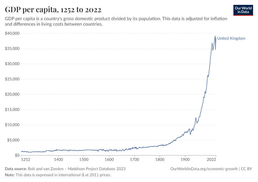 One of the very first countries to achieve sustained economic growth was the United Kingdom. In this chart, we see the reconstructions of GDP per capita in the UK over the last centuries.